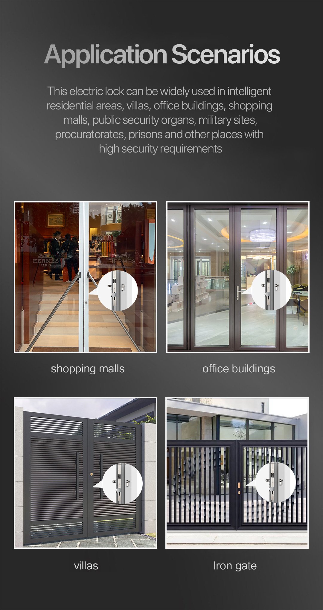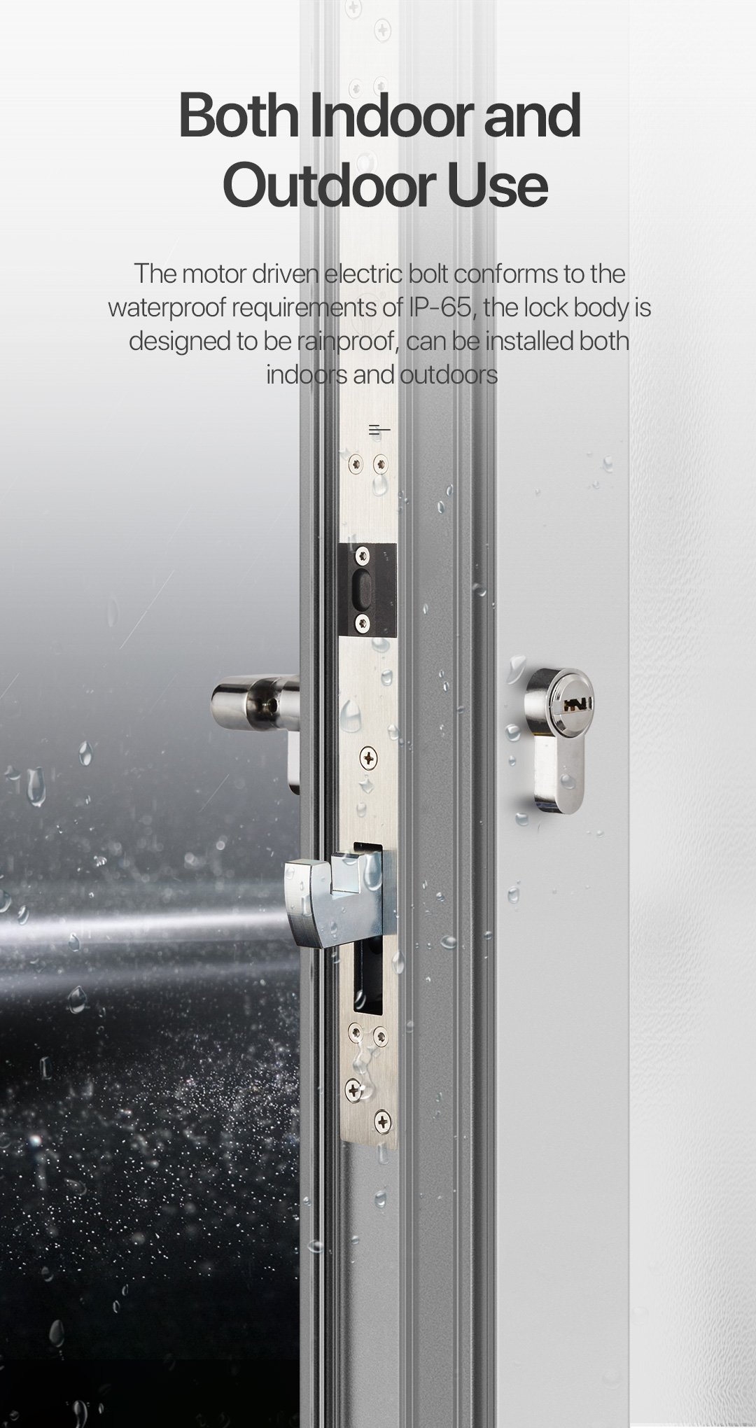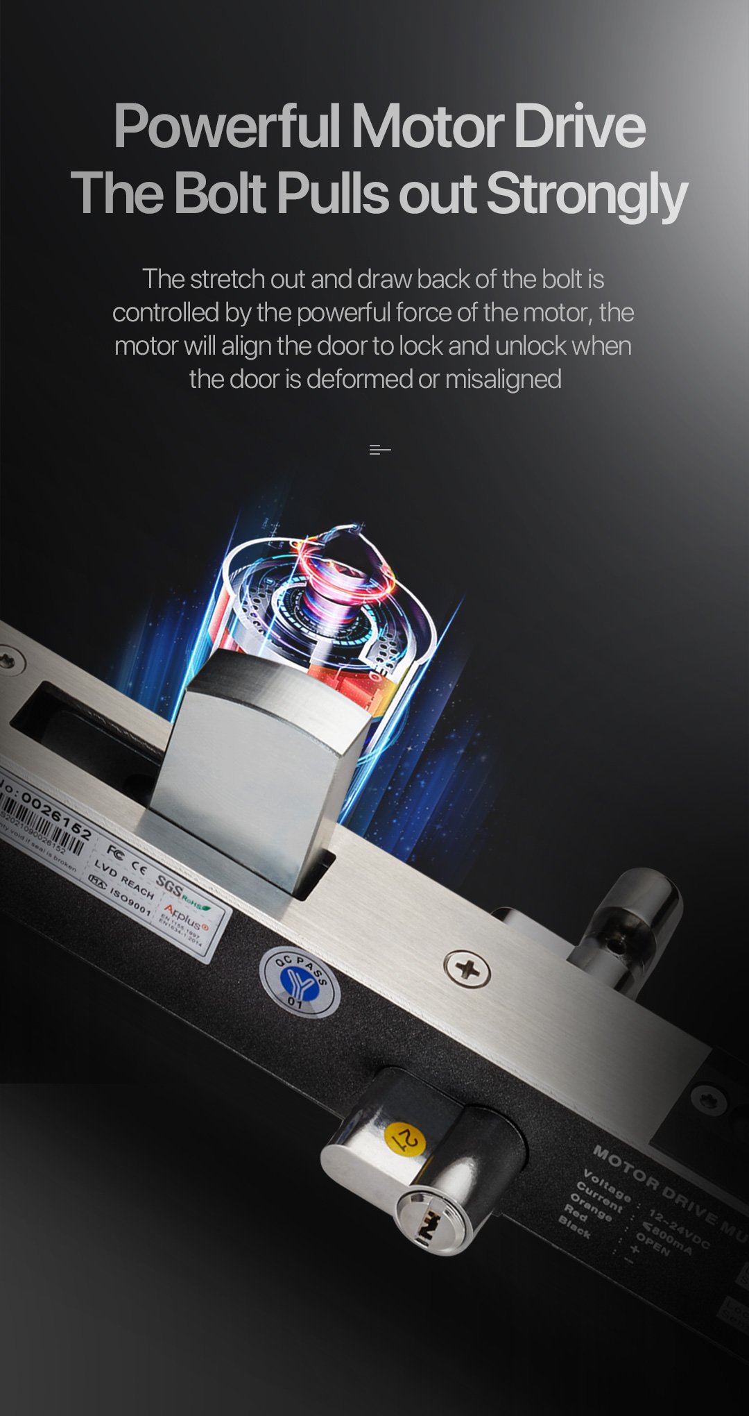Motor driven mute electric bolt,the bolt is controlled by motor drive to realize lock and unlock. The driving force of the motor is very strong,the bolt can be pushed out by the powerful thrust of the motor to align the door when the door is deformed or misaligned. The parts are made of lightweight materials, work more smoothly, less resistance, can achieve mute when lock and unlock.The PCB is equipped with an electronic protection device to realize the precise control of locking and unlocking. In addition,compared with the traditional electric bolt which uses electromagnet to lock, which is low power consumption, energy saving and environmental protection.