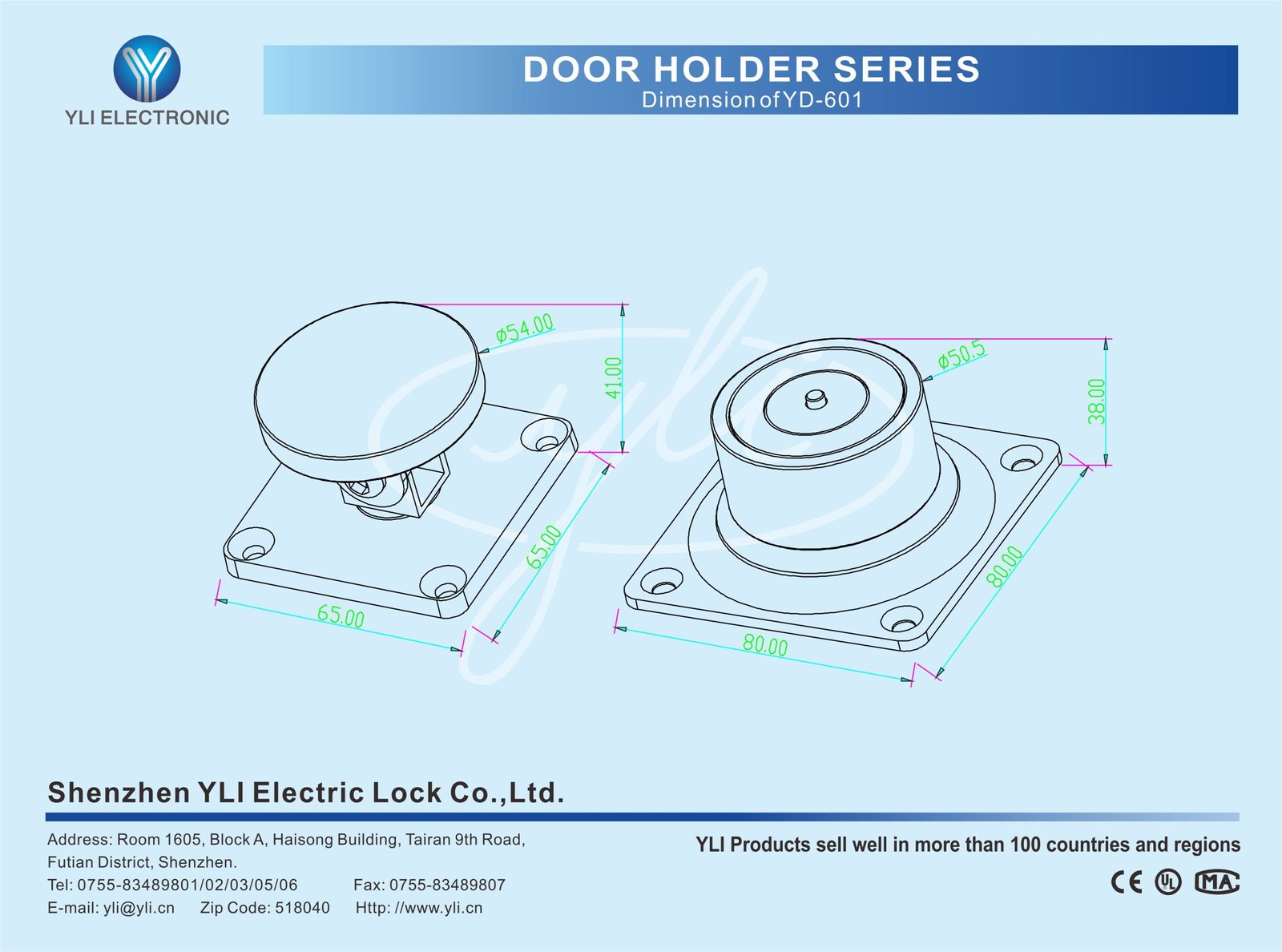 YD-601 is a standard type wall mount door holder .which adopts low power consumption, that makes it more environment friendly and more durable. The Holding Force(Collinear Load) is 50kg(110Lbs)Professional anti-residual magnetism design ensures highest security. It will release automatically the fire door when fire alarms. It also contains build-out release button for testing and build-in MOV which reverse current protection.