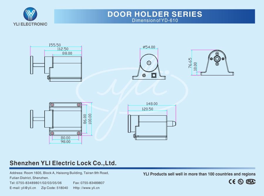 New type of electromagnetic device,electromagnetic part combines with armature plate.Integration of structure and function.Fail Safe.Build-in bolt&LED&release button.Bi-directional voltage feature.Technical feature description,all-in structure,its characteristic:die casting,all-in structure;Technical feature description,build-in bolt,its characteristic:applying principle of spring,bolt works as linkagewith armature plate;Technical feature description,bi-directional voltage feature,characteristic:12VDC/24VDC optional