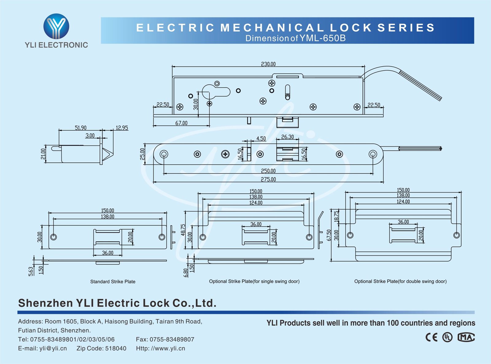 YML-650B is our electromechanical lock,which is suitable for one-way open and two-way open doors,including wooden door,metal door,framed glass door etc.Stainless steel housing,unique design for safety requirement,switches to working mode by manual control.Bolt bears up to 1000lbs strike,coming with European type cylinder.In working mode,it’s under control by electricity while by manual control if under emergency.All linkages are metal structure.Work normally under the temperature between -40℃and 60℃.Pass 500000 times test.Outstanding performance,prior choice for project.