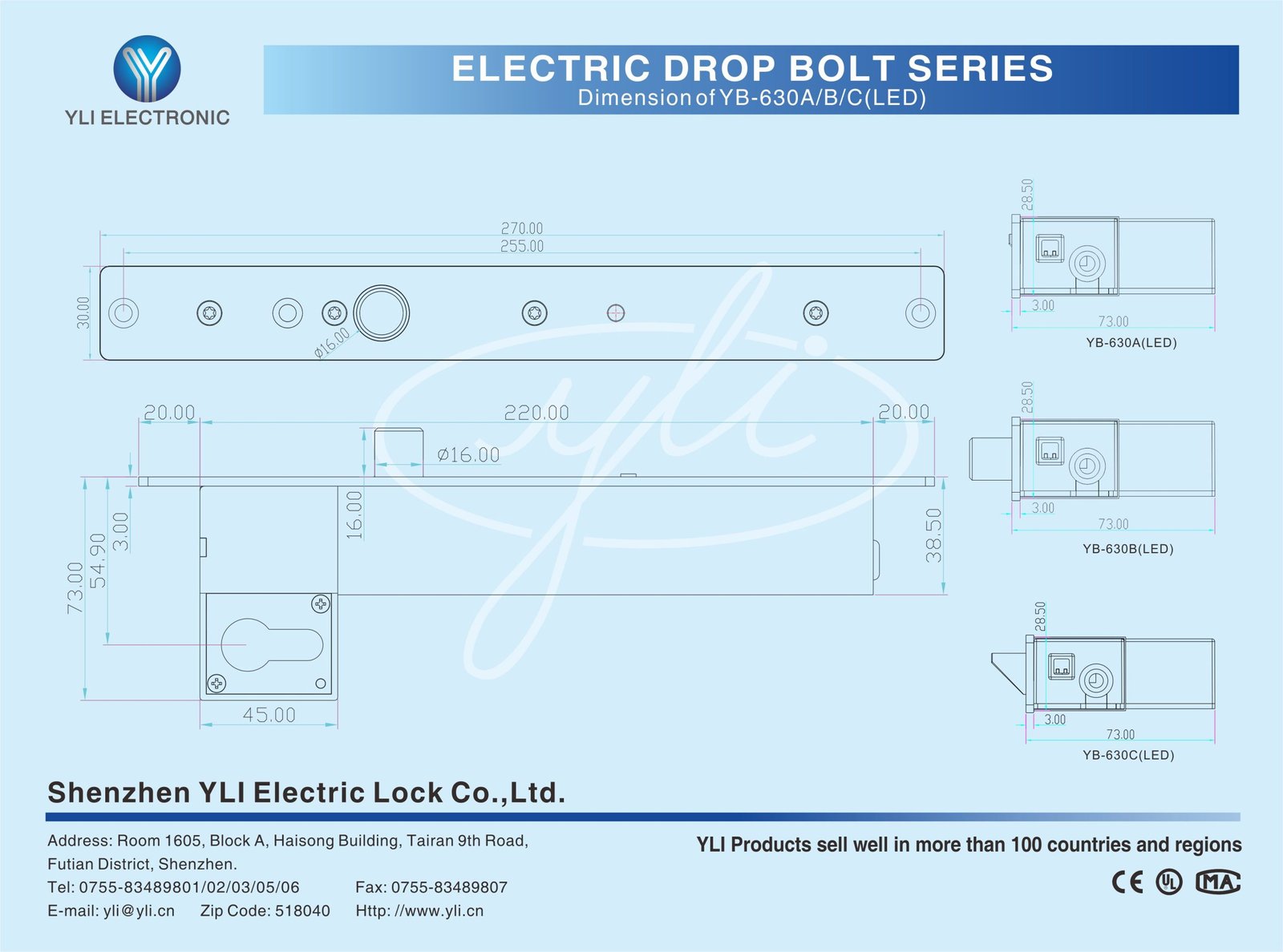 YB-630B (LED) is an all-metal construction electric bolt .with European-type cylinder and has both electric control and manual control functions. Based on the all-metal linkage parts,It can work at the temperature of 60 ℃ or -40 ℃ .The CNC lathe create the 304 stainless steel Bolt, which can bear with 2000kg holding force.